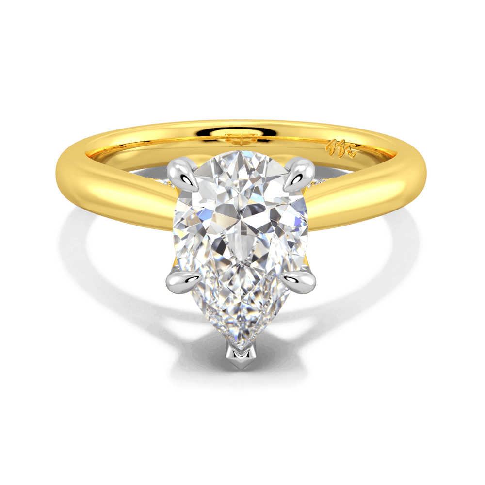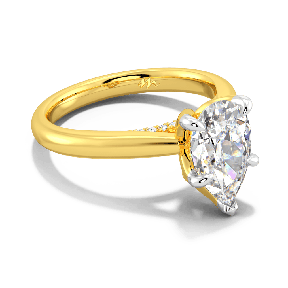 Blending softness with structure, the ‘Monet Pear’ ring sparkles with a pear cut Moissanite cradled in a 5-prong petal basket. The softly tapered band and accented bridge give this elegant, floral-inspired cathedral design a contemporary edge.