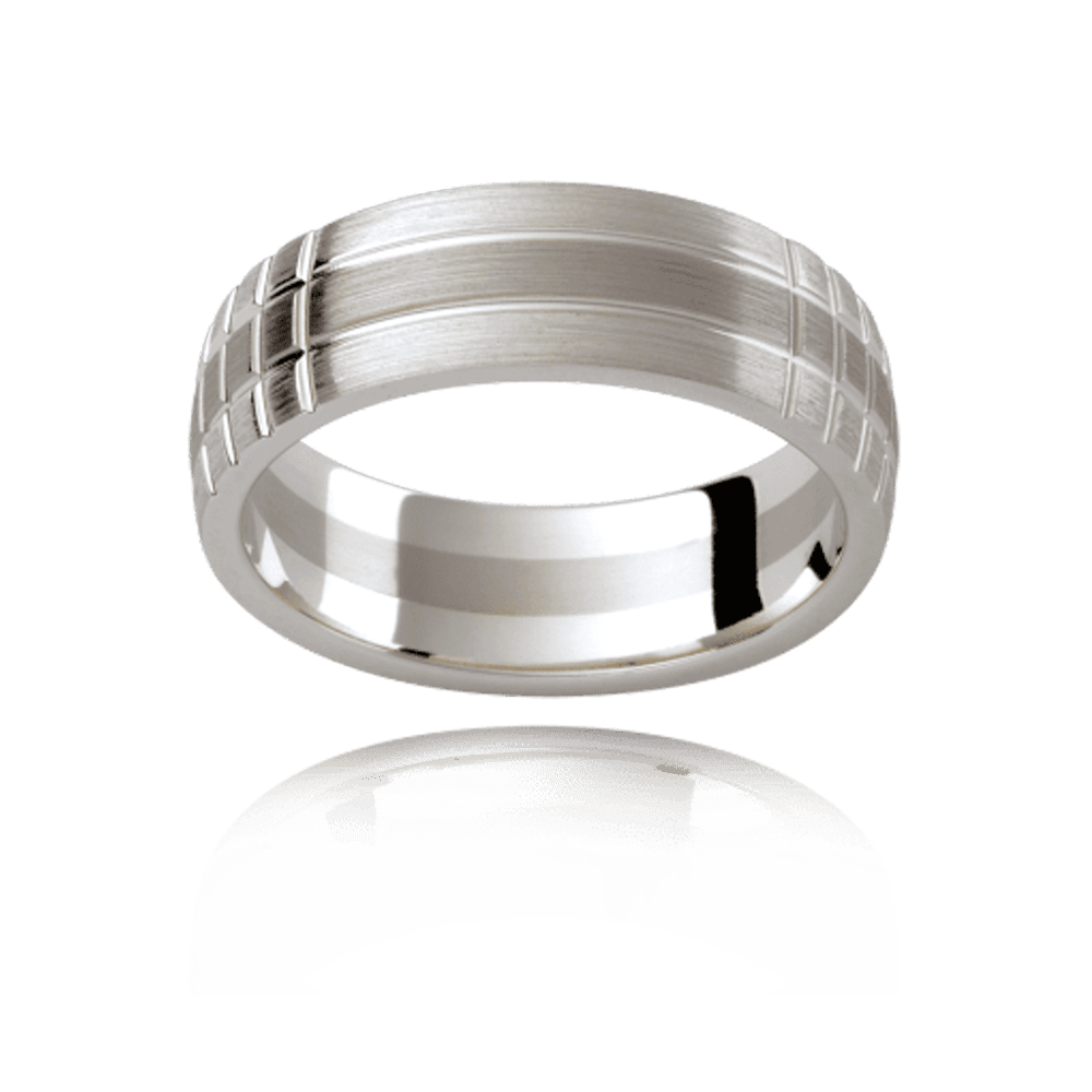A combination of 9K white gold with 18K white gold centre section. Polished patterned grooved lines
